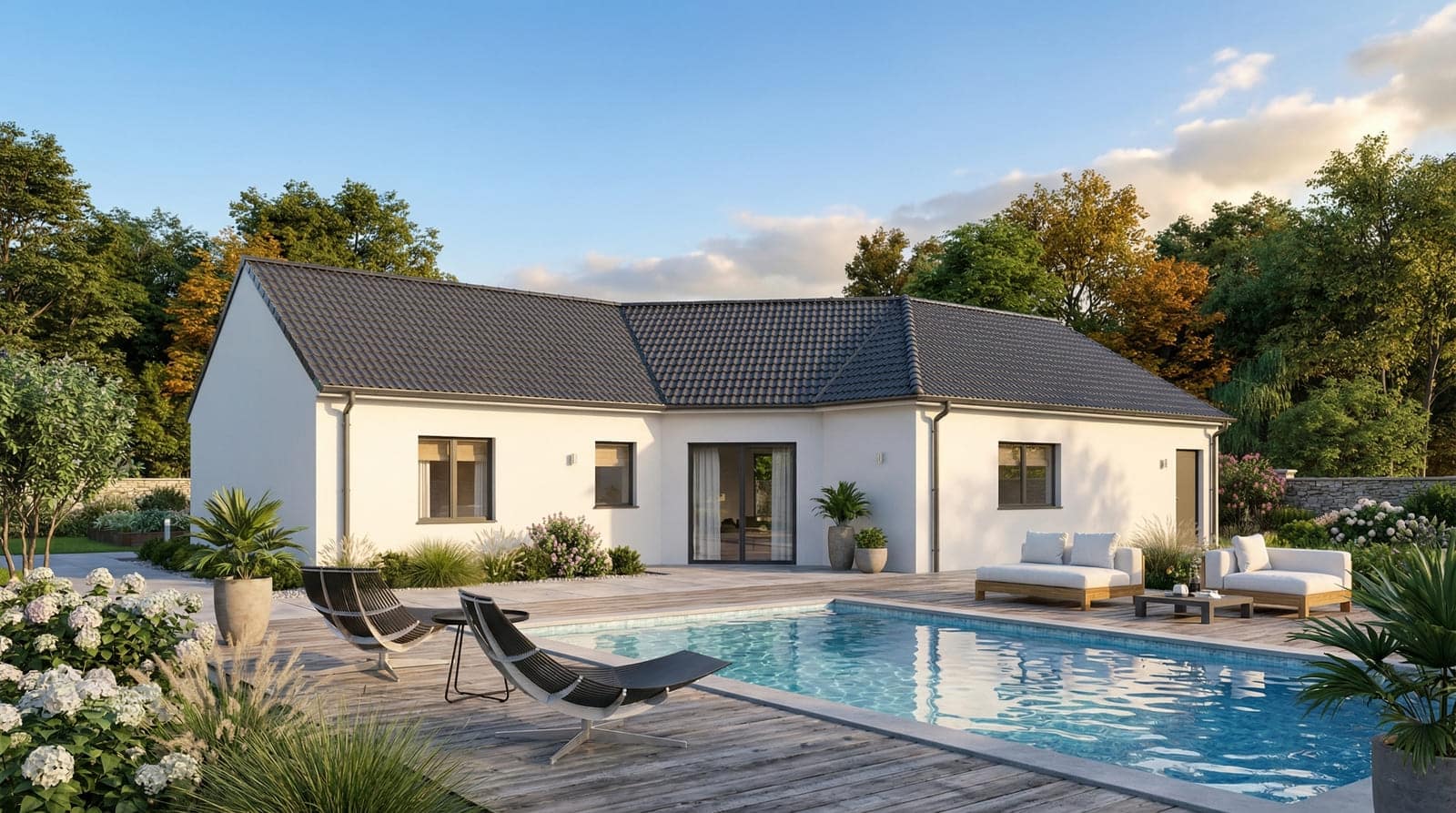 Maison de plain-pied au plan en V, l’Evolutive est idéale pour les terrains étroits. Proposée en version à 2, 3 ou 4 chambres, elle porte bien son nom car elle est ultra personnalisable !