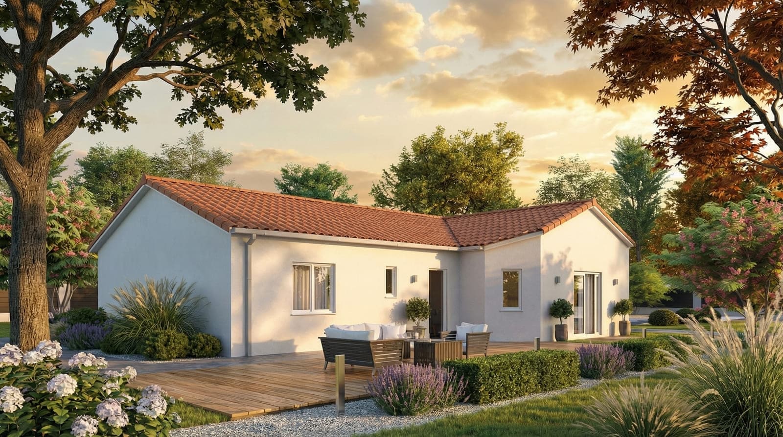 Avec une surface de 100 m², cette maison de plain-pied dispose de 3 chambres et de 4 pièces, offrant ainsi un espace de vie fonctionnel et facile à vivre. Le porche d’entrée avec colonne confère à sa façade un aspect original et accueillant, tandis que son très beau toit habillé de tuiles en terre cuite H10 ajoute une touche de charme supplémentaire.